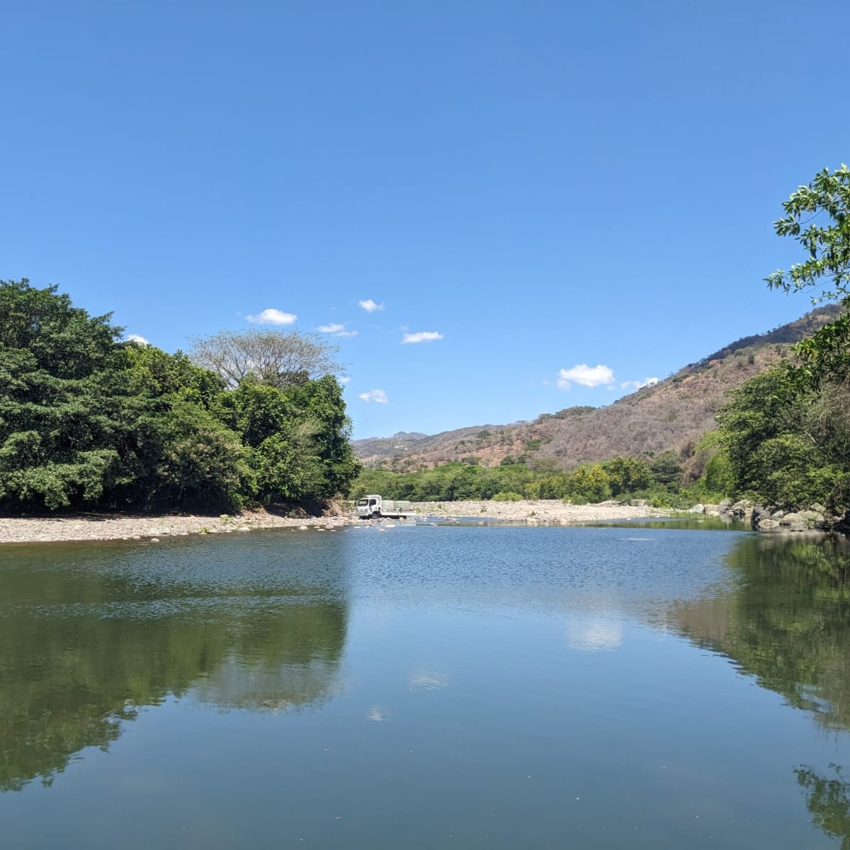 活動地域のレイトカを流れる川。雨季になると川が増水し、大回りする必要が…。ちなみに、川の上流には温泉が!地元の人は温泉卵やカップラーメンを楽しんでいます。