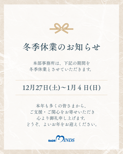 12月27日(土)~1月4日(日)まで、年末年始休業のため、岡山本部事務所はお休みです。
