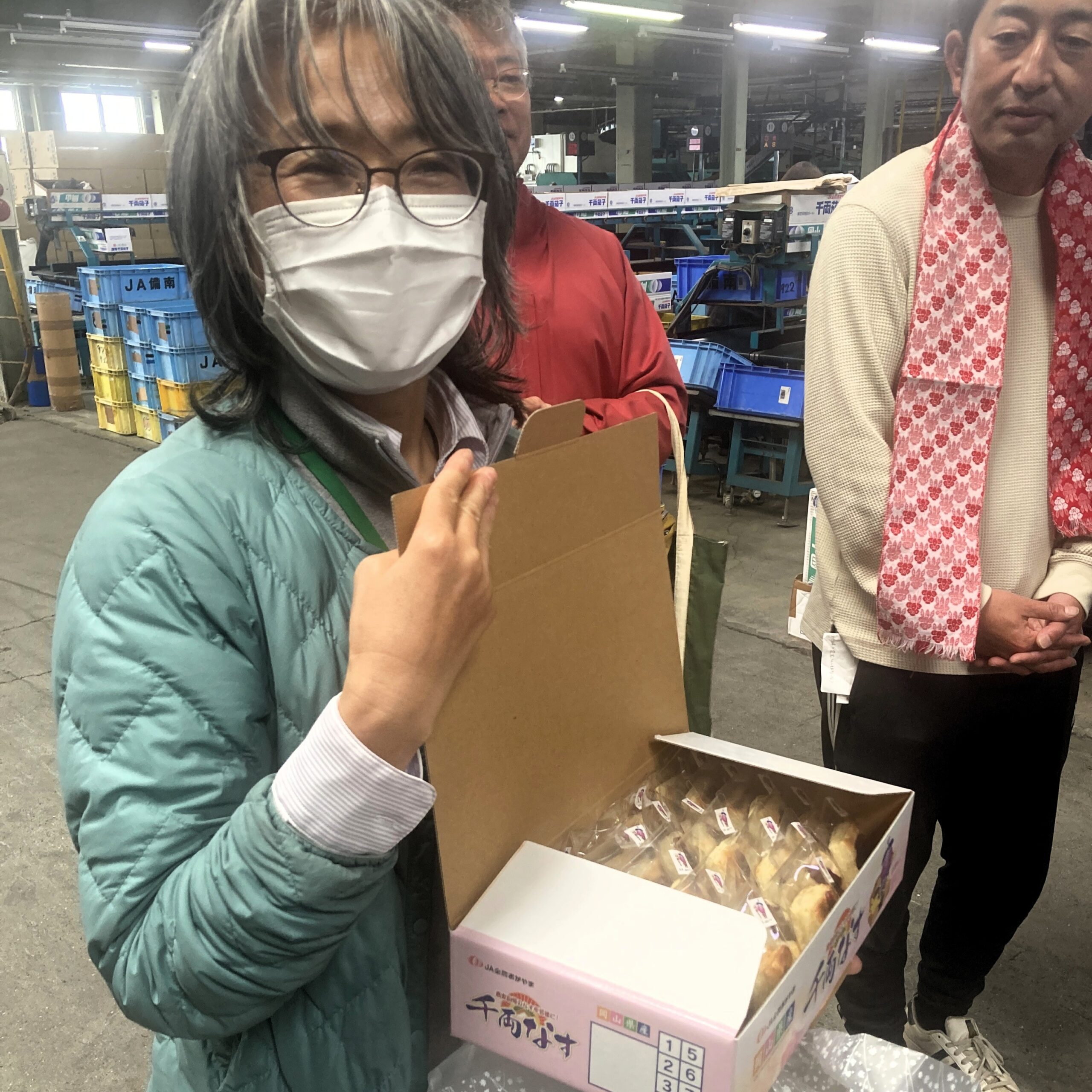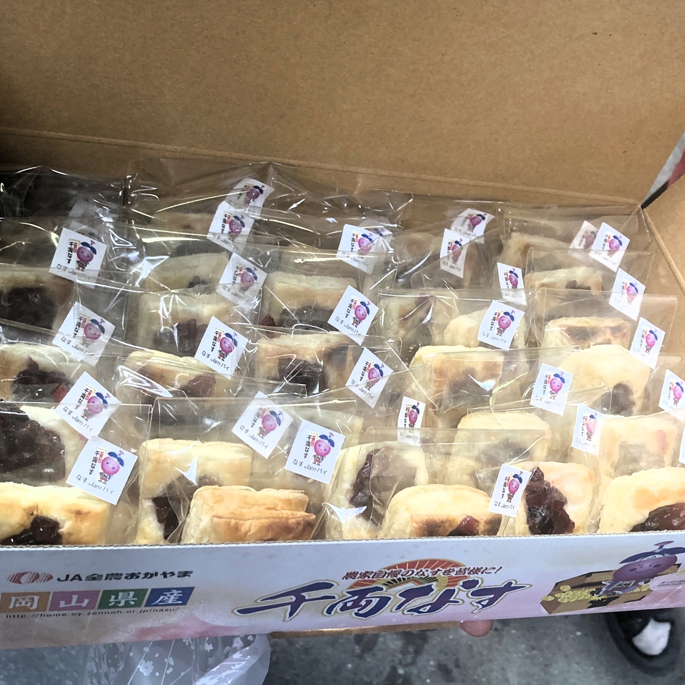 視察の終盤、同センターの荒木さんが手にしていた袋から取り出してくださったのは、千両茄子のマスコットキャラクター「あっぱれ健紫郎」が描かれた箱。中には、山盛りの「千両茄子パイ」。生産者部会婦人部の皆さまが、ネパールからの研修生をもてなそうと前日に集まり、一つひとつ手作りしてくれたそうです。まさにサプライズプレゼント!