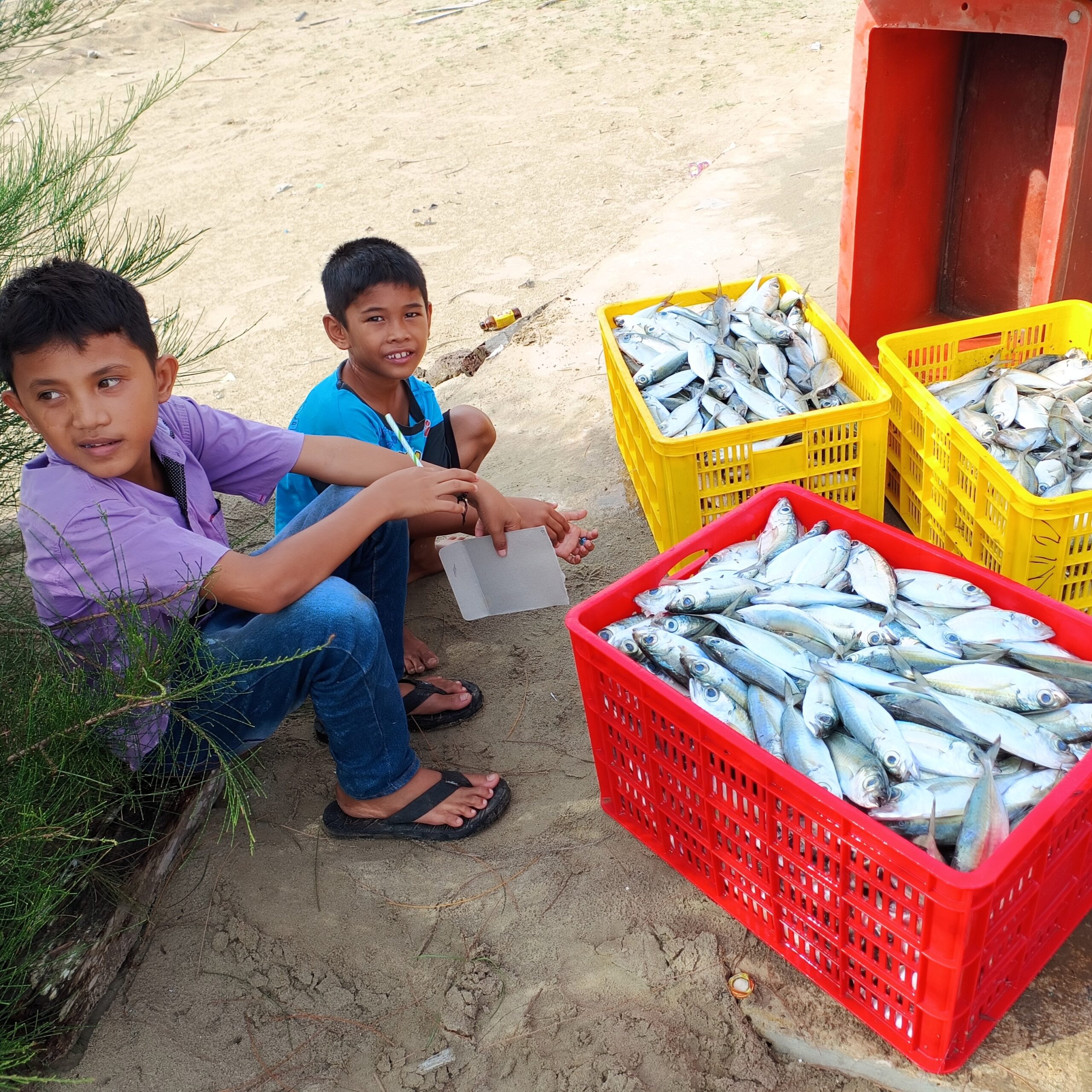 • アジの一種だろうか。出荷を待つ魚と作業を見守る子どもたち