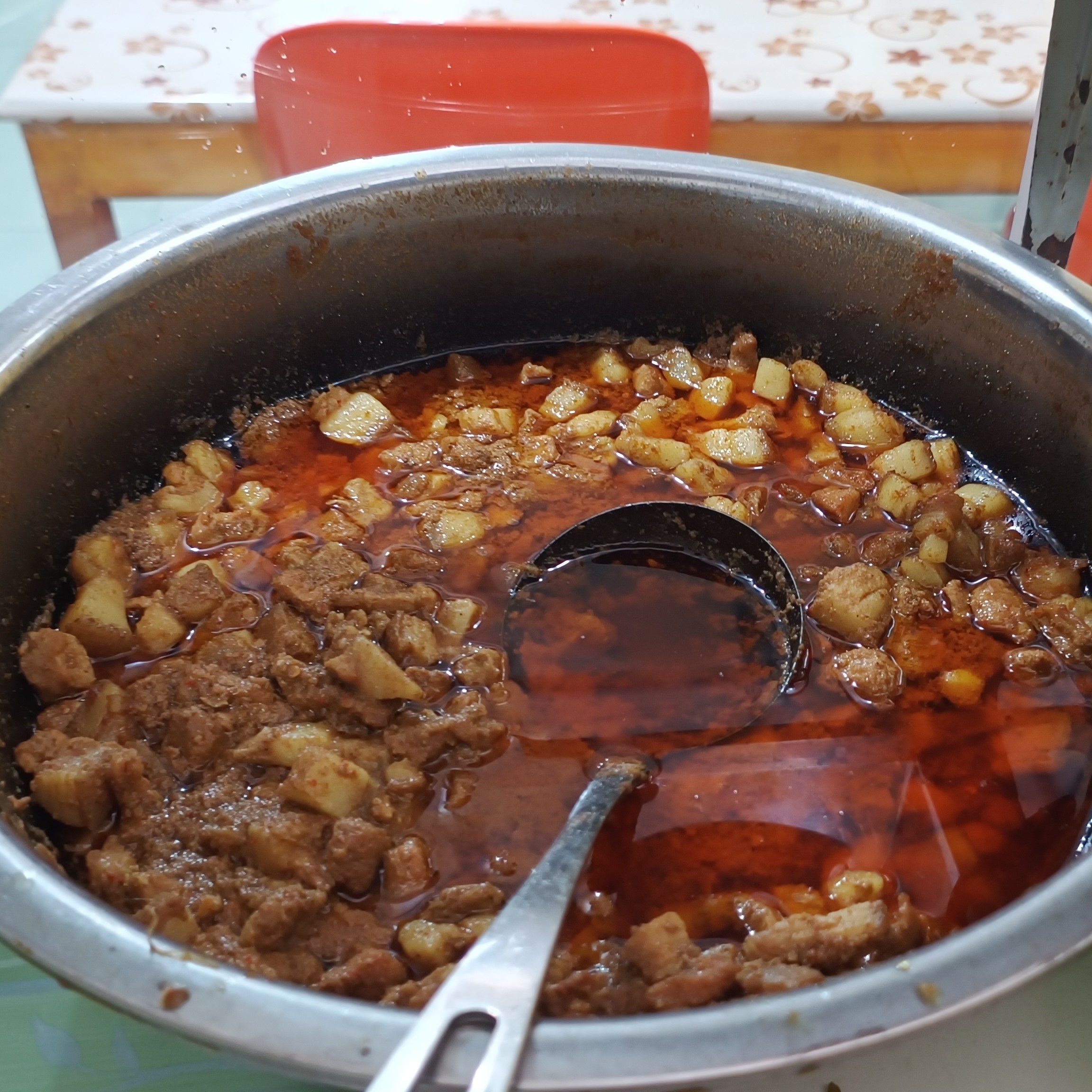 彼らに別れを告げた後、私を乗せたレンタカーはドリーム・プロジェクトの多数の跡形が残る村々(=竜宮城)を去り、遅い昼食をとることにした。私を過去の世界に導いてくれた運転手から「豚肉を食べることはできるか?」と尋ねられた。人口の半数以上がイスラム教徒であるこの国では、その可否を尋ねるのは礼儀である。また豚肉を提供する場所は限られており、キリスト教徒や華人など、非イスラム教徒にとってご馳走の一つである。車は15分ほど南へ向かい食堂にたどり着いた。大鍋の中で煮込まれた角切りの豚肉料理はこの島でも一般的であるが、変わらぬ味を確認した。ちょうど夕立が優しい雨を連れてきた。季節にもよるが、夕立の訪れは変わらぬもの。